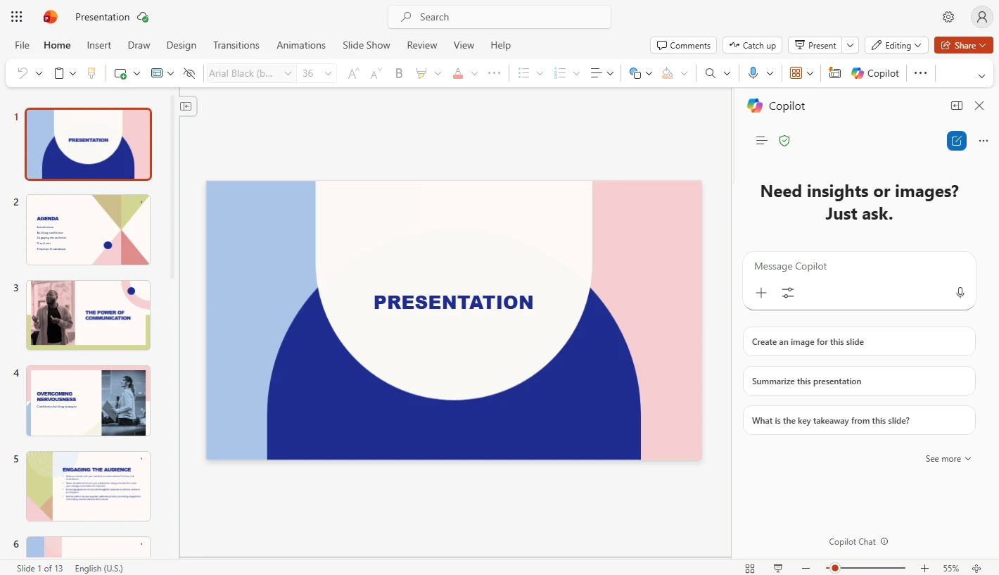 Create slides quickly from ideas. Copilot helps generate slide structures for you.